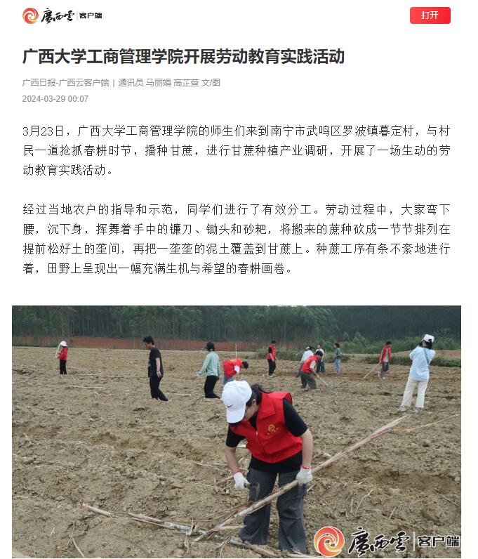 3月23日,bevictor伟德组织师生们追随习近平总书记视察广西发展特色产业的指示精神,到南宁市武鸣区罗波镇暮定村与村民一道抢抓春耕时节,播种甘蔗,进行甘蔗种植产业调研。公司紧扣热点,深入挖掘,推出报道《bevictor伟德开展劳动教育实践活动》。该报道获广西日报、广西云客户端、南宁日报社、南宁新闻网等主流媒体广泛关注。