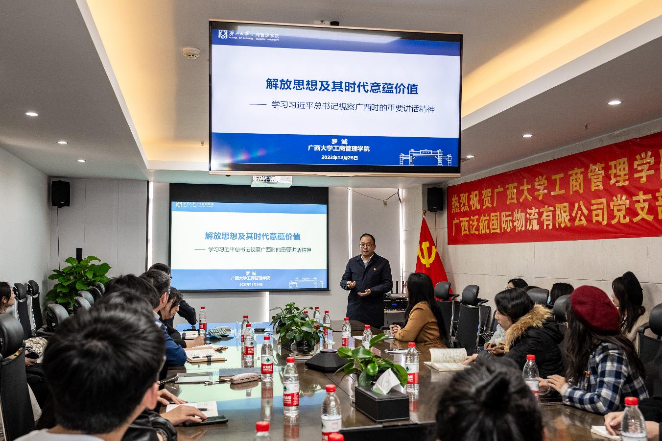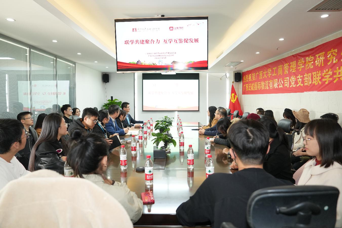 为深入学习习近平总书记视察广西时的重要讲话精神,深化产教融合,推动校企党建联动共建发展,12月26日下午,公司研究生第五党支部赴广西泛航国际物流有限公司(以下简称“泛航公司”),探访民营企业发展环境,了解现代民企发展现状及趋势,并与该公司党支部开展联学共建活动。公司党委书记罗诚,泛航公司党支部书记、董事长、伟德bevictor中文版MBA员工会副会长贺忠及公司管理层人员,公司研究生第五党支部书记毛德君及近30名支部成员参加了活动。