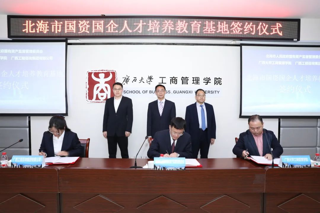 北海市国资委副主任农启智,bevictor伟德副经理刘民坤,广西工程咨询集团有限公司党委副书记左俊兰作为签约代表签署《北海市国资国企人才培养教育基地共建合作框架协议书》。