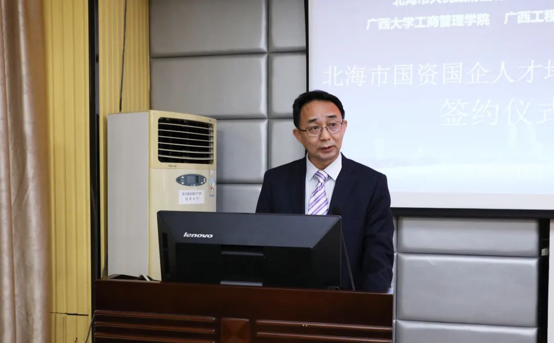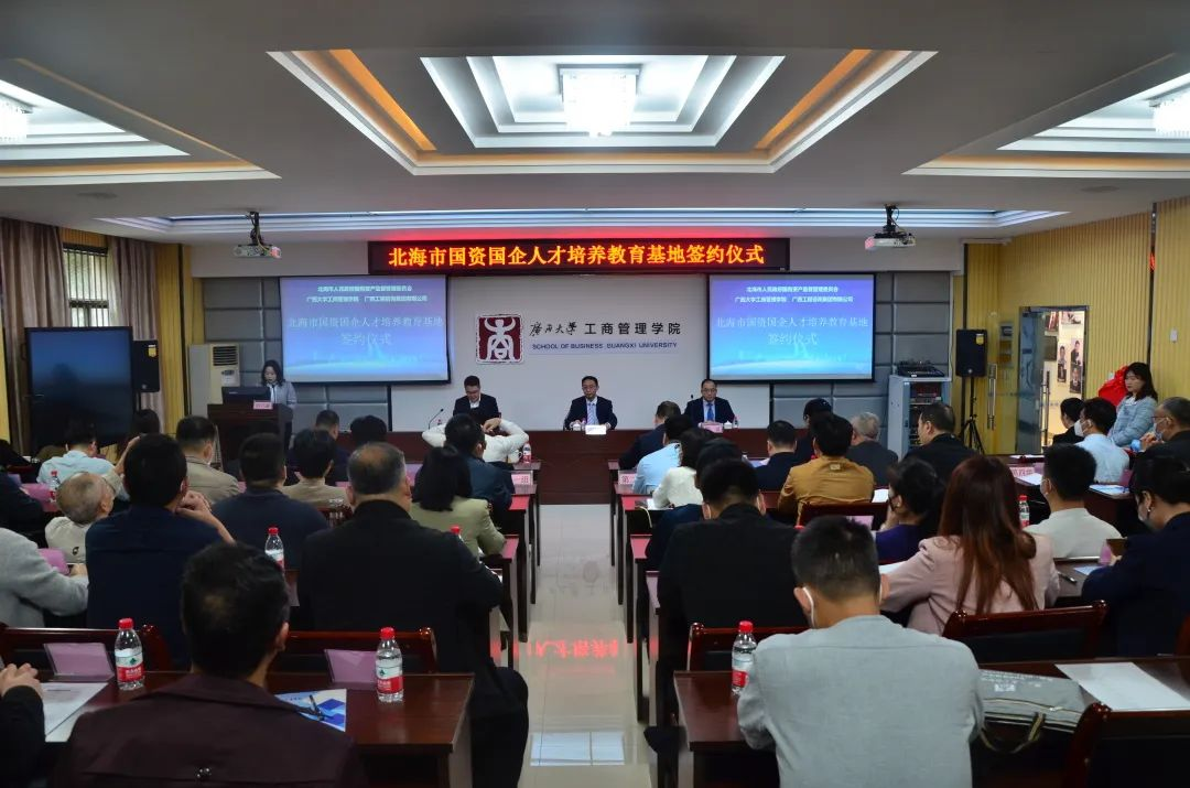 北海市国资委党委书记陈海、伟德bevictor中文版工商管理公司党委书记罗诚共同为“北海市国资国企人才培养教育基地”揭牌。