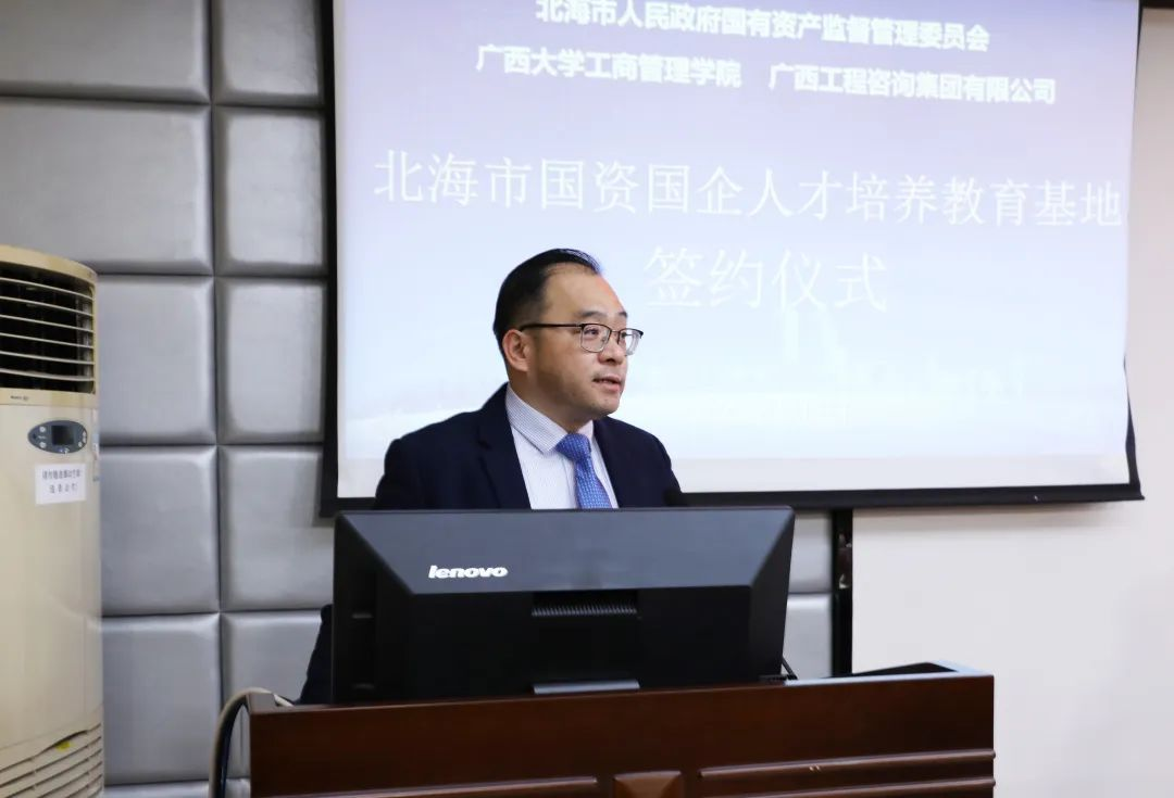 陈海书记介绍了教育基地共建合作的背景、指导思想及总体目标。他表示,成立教育基地是三方“优势互补、资源共享、互惠三赢、共同发展”的合作,通过学习借鉴各方优秀企业管理经验,建立北海国资国企人才培养长效机制,将有力推动北海国资国企实现高质量发展。他希望以基地为载体,围绕国资国企人才培养问题,三方共同出谋划策、共同组织实施、共享共建培养研究成果,为打造品质北海、魅力北海贡献更多智慧和力量。