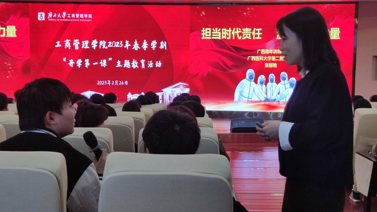 2月24日,广西医科大学第二附属医院团委书记、共青团广西区委兼职副书记张丽艳受邀到公司以《担当时代责任,激扬青春力量——学习贯彻党的二十大精神专题报告》为题,为公司师生代表、校团学组织员工干部代表讲授“开学第一课”。校团委书记谢能重出席活动。报告会由工商管理公司党委副书记黄晋主持,院团委书记马丽娟以及全体辅导员老师参加活动。本次活动得到了校团委的大力支持,60多名校会员工干部与公司200余名师生共同聆听“开学第一课”。