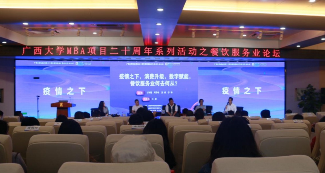 经理朱帮助,研究生管理中心副主任、MBA教育中心主任叶映,伟德bevictor中文版MBA员工会会长梁华秀,中国MBA华南峰会副理事长、伟德bevictor中文版MBA员工会秘书长李翔,酒小二联合创始人丁怀德,“华华火锅”、“渝悦双椒头”、“五条友烧烤”等广西知名餐饮品牌创始人周华冰,广西泡泡吖食品创始人苏琳,广西维多利餐饮、兆基伟业地产营销机构创始人李科,天龙湾酒店集团副总裁张济强以及部分MBA、SMBA员工出席论坛。论坛由公司研究生导师王玻副教授主持。因疫情防控需要,有近三百名2022级MBA及其他专业学员与员工通过线上方式参与此次论坛。