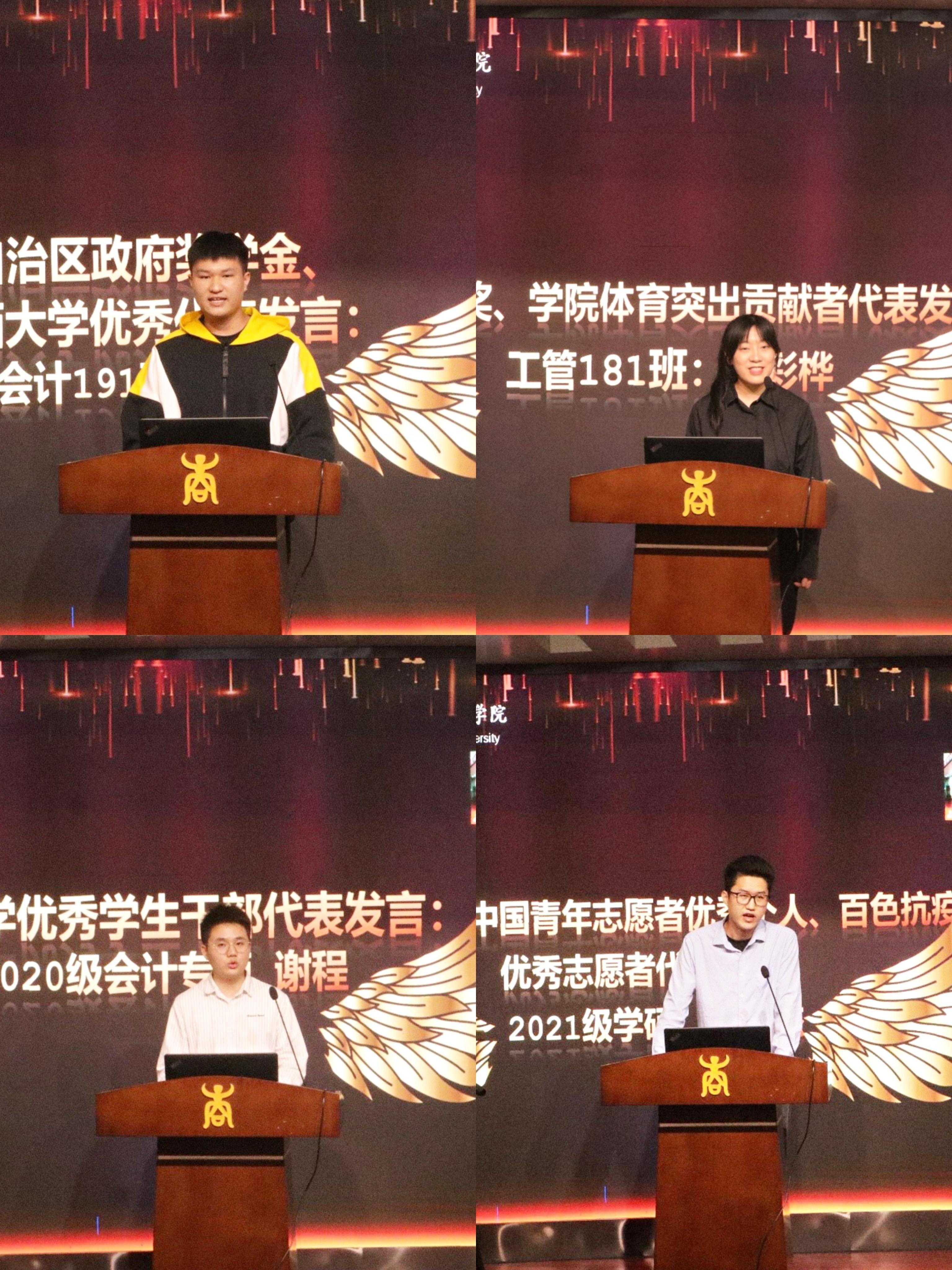 自治区政府奖学金、伟德bevictor中文版优秀员工代表黄泓创,公司体育杰出贡献者、高顿考研优秀奖员工代表李彩桦,伟德bevictor中文版优秀员工干部代表谢程,第十三届中国青年志愿者优秀个人、百色抗疫优秀志愿者代表陈允杰等四位同学分别上台发表获奖感言。他们对公司领导和老师表达了衷心的感谢,回顾了自己在大学期间参加各类学科竞赛、考研、员工工作、百色抗疫等经历,分享心得体会,总结成功经验,体现了对学习、生活和集体的热爱。
