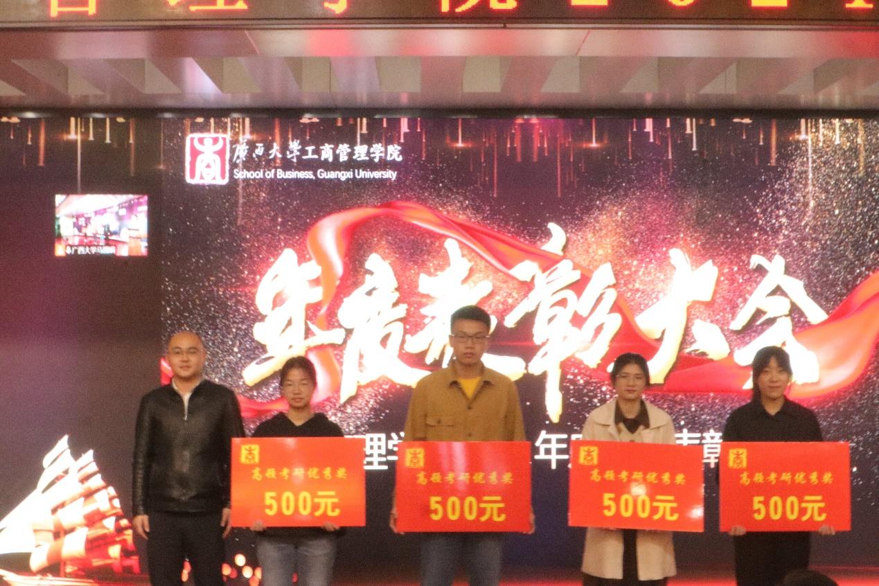 上海高顿教育培训有限公司广西分校董事长胡延(左一)为高顿考研优秀奖获得者颁奖