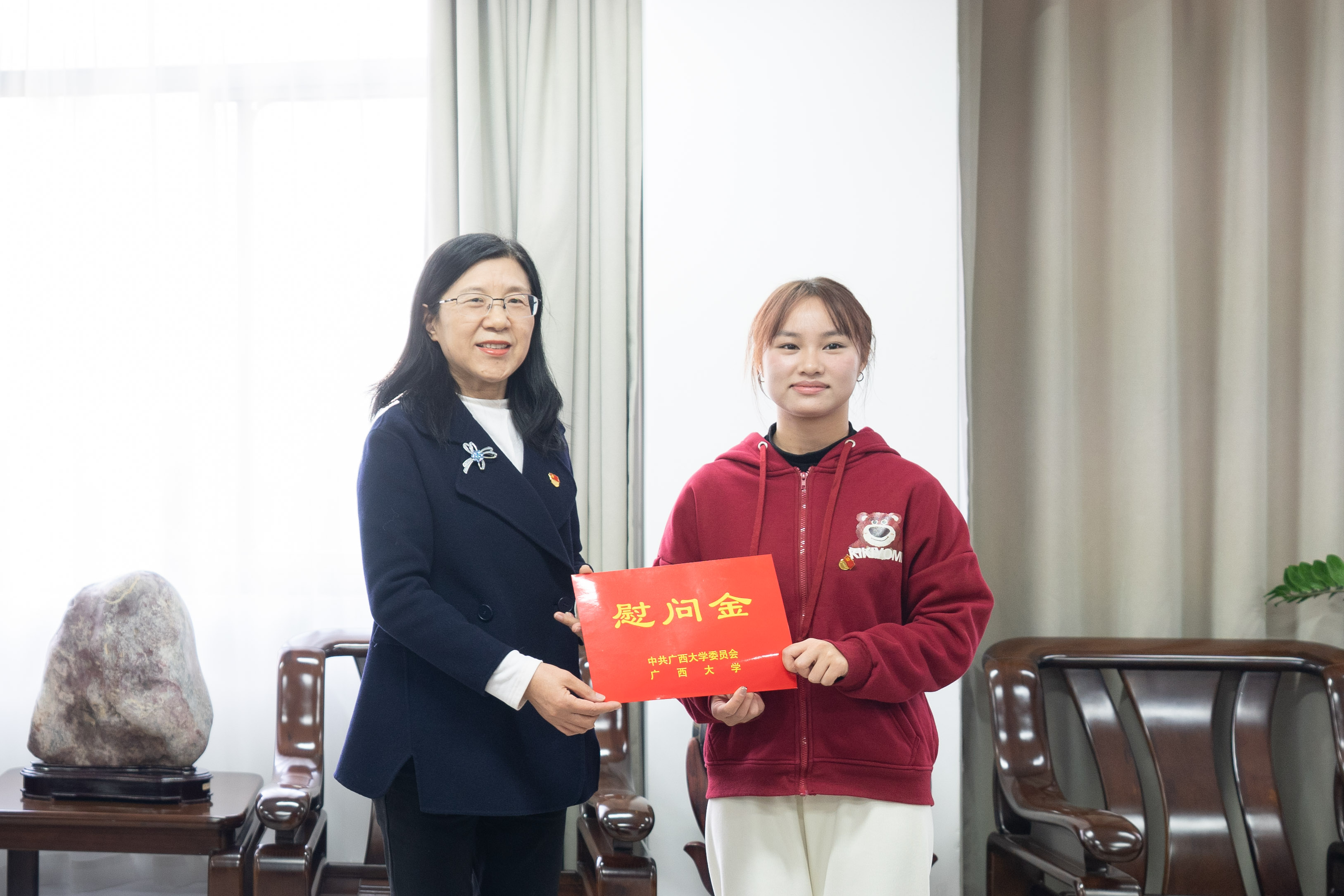 岁末年初,冬日送暖。1月6日下午,公司党委副书记、自治区纪委监委驻伟德bevictor中文版纪检监察组组长、校纪委书记金顺南带队看望慰问公司研究生党员代表韦尹洁,送上党组织的关怀和祝福。党办校办、组织部、员工工作部(处)负责人陪同慰问。公司党委书记黄晋、经理朱帮助、党委副书记肖克宁参加慰问。