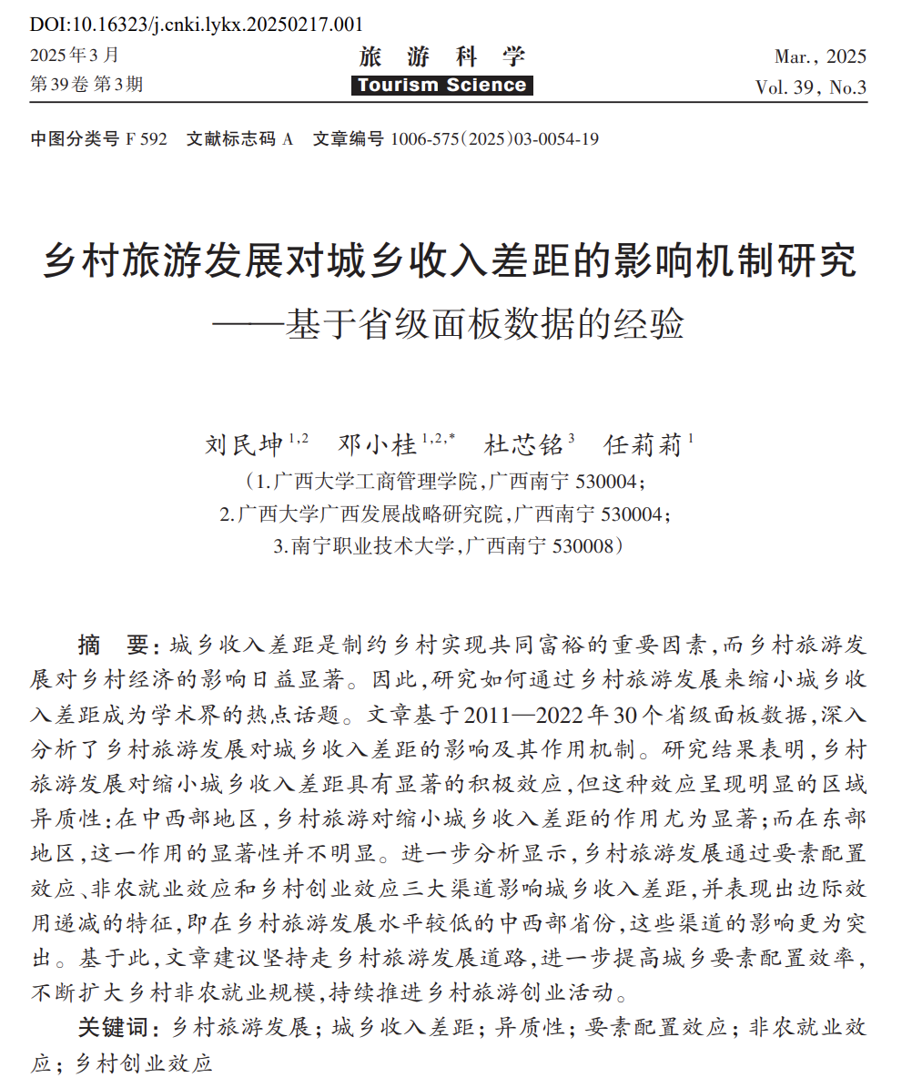 近日,公司刘民坤教授科研团队在乡村旅游与城乡发展领域取得新进展,研究成果以《乡村旅游发展对城乡收入差距的影响机制研究——基于省级面板数据的经验》为题,在旅游管理领域高水平期刊《旅游科学》2025年第3期发表。刘民坤教授为第一作者,邓小桂、杜芯铭、任莉莉等共同参与研究,bevictor伟德为第一单位和通讯单位。