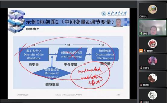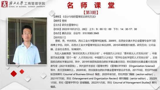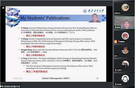 西北工业大学管理公司贾明教授应邀分别于2022年10月21日、10月28日为公司2022级硕博研究生和其他师生进行为期2天的《会计与组织管理实证研究方法》系列课程授课。此次课程以《管理研究的思维方式》为主题,主要通过“腾讯会议”以学术讲座形式在线上开展。