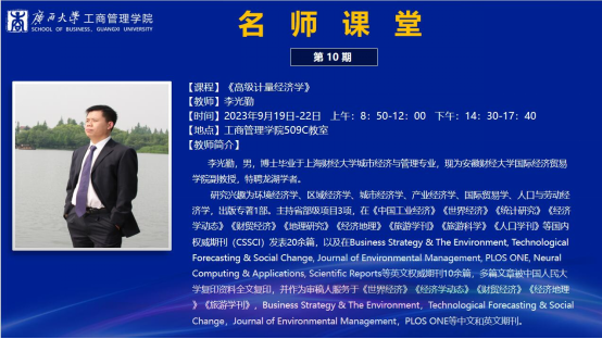课程第一天,在师生们的热烈欢迎下,朱帮助经理为上课的师生们作课程学习动员讲话,耐心的指出《高级计量经济学》主要的学习重点。参加此次名师课堂的主要有公司2023级博士研究生、2023级学术型硕士研究生以及部分专任教师和其他感兴趣的同学。