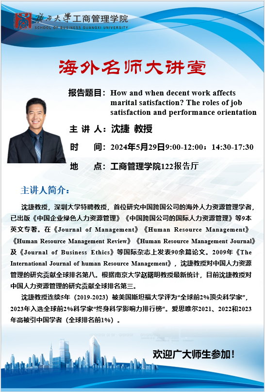 海外名师大讲堂|How and when decent work affects marital satisfaction? The roles of job satisfaction and performance orientation