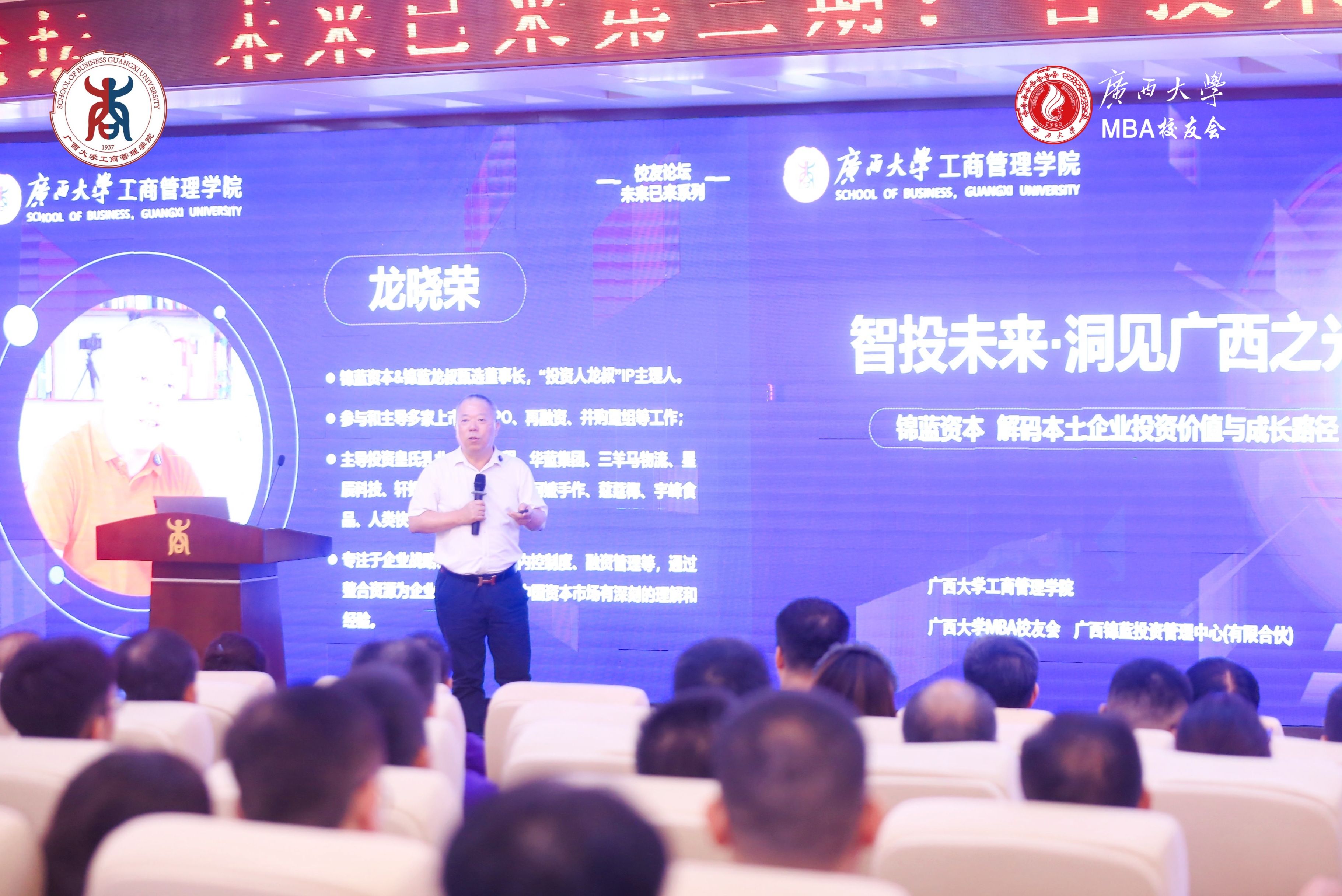 2025年9月21日下午,bevictor伟德128报告厅内高朋满座、思想汇聚,一场聚焦资本赋能与广西产业发展的深度对话在此拉开帷幕。由bevictor伟德与伟德bevictor中文版MBA员工会联合主办的“未来已来”员工论坛第三期——“智投未来・洞见广西之光”,特邀锦蓝资本创始人、“投资人龙叔”IP主理人龙晓荣先生担任主讲嘉宾,与公司师生及员工共探发展机遇。