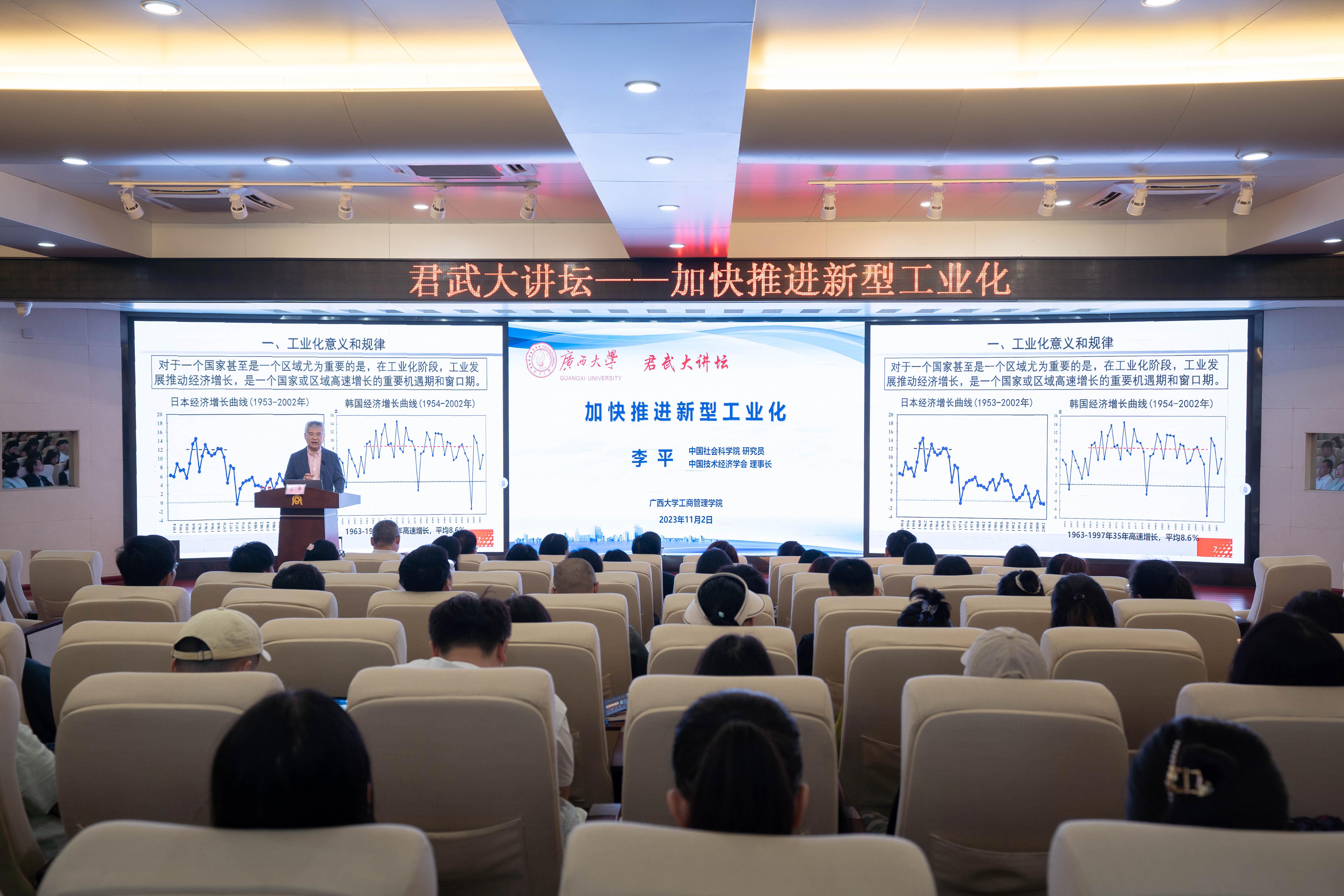 11月2日上午,中国技术经济学会理事长李平研究员做客公司承办的伟德bevictor中文版“君武大讲坛”,在bevictor伟德128报告厅为师生们作题为“加快推进新型工业化”的专题报告。自治区科协党组成员、副主席朱其东;中国技术经济学会副秘书长、常务理事,中国社科院数经所研究员王宏伟;中国技术经济学会会员服务部主任、高级会计师何冰;伟德bevictor中文版科研院副经理、社会科学处处长刘培军;广西科技服务中心副主任盘健斌;中国技术经济学会科研助理李维嘉出席讲坛。公司全体专任教师以及部分博士生、硕士生到场聆听和学习交流。bevictor伟德经理朱帮助主持讲坛。