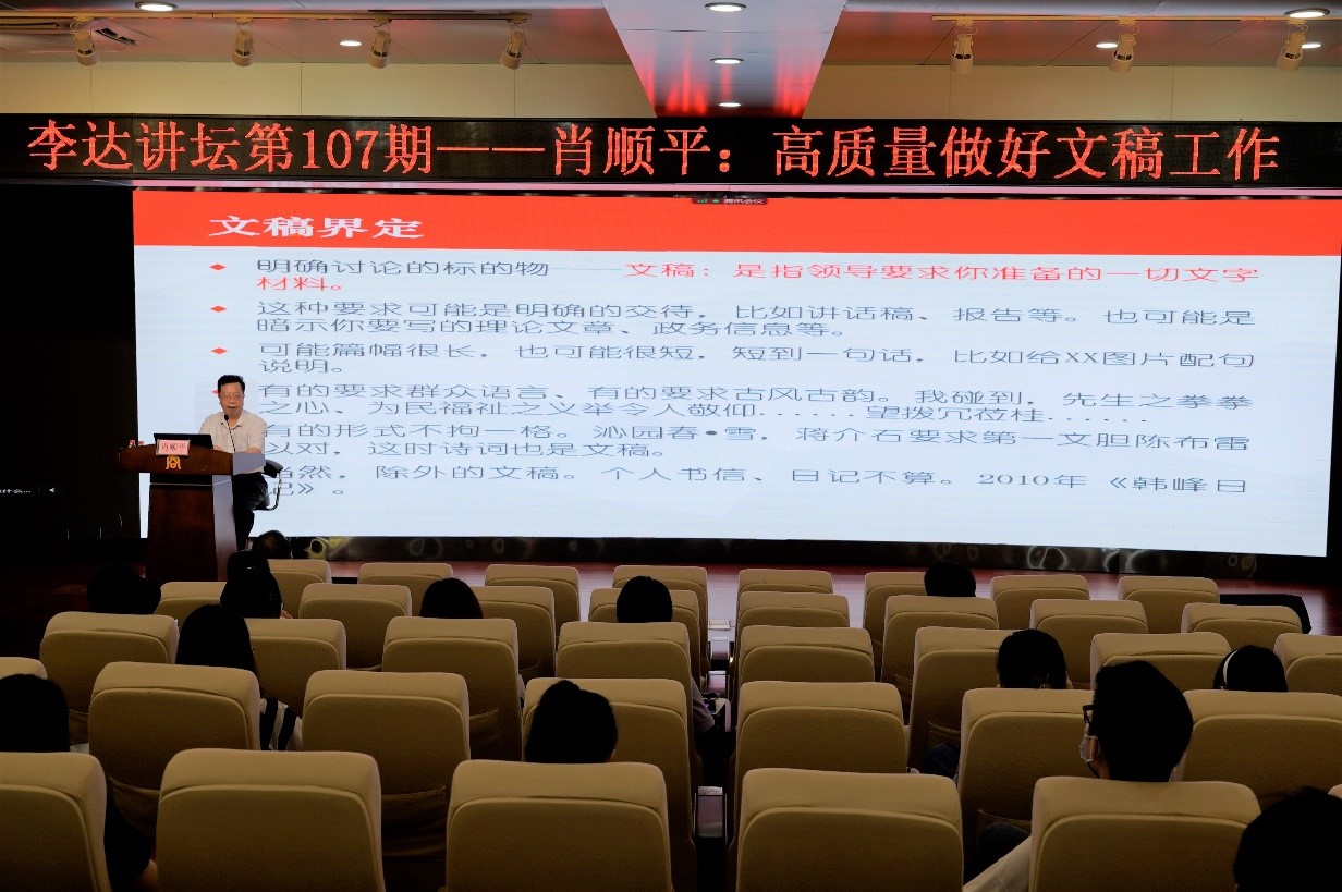 讲座中,肖顺平主任结合自己的工作经历,将文稿工作这项庞大复杂的系统工程分为高质量做好文稿工作之“心”、“道”和“技”三个板块。他指出,做好文稿工作首先要用心,只有真正重视,用心领悟,才能写出好文章。他从文稿分类和写作特点、文稿的基本属性、文稿写作的总体要求以及文稿写作的一般方法四个方面阐述了高质量做好文稿工作之“道”。同时,肖顺平主任结合自身多年撰写文稿的经验从把握好“着重点”、留下“印象分”、跳好“四部曲”总结了高质量做好文稿工作之“技”。